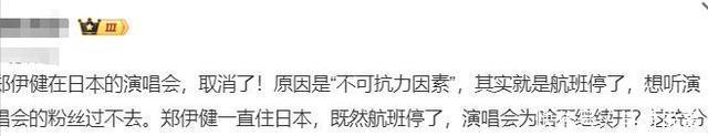 粉丝超给力 有一个粉丝指出了关键问题,郑伊健的演唱会开在日本,原因“不可抗因素”既然航班停了,中国人去不了,日本人也可以去听,不至于说开不了,其实就是他在日本人那里没有什么观众缘。 只薅中国人的羊毛,在国外开演唱会,咱们国家的大好河山哪个地方不能去开演唱会,为什么偏偏要去日本开演唱会,促进日本的消费,而日本人都不买账。